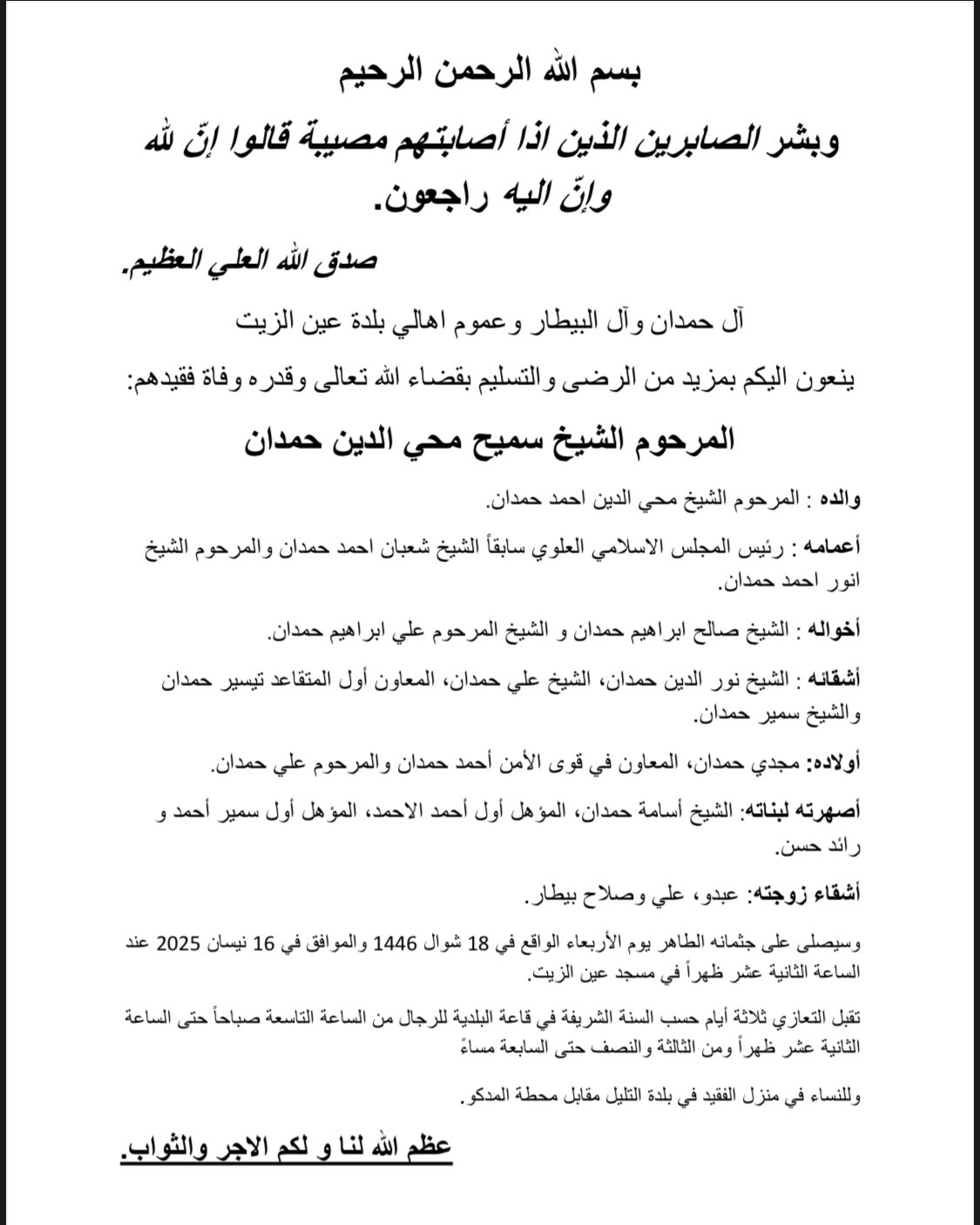 - بيان شكر وتقدير من آل سليمان – المراحات، عكار العتيقة